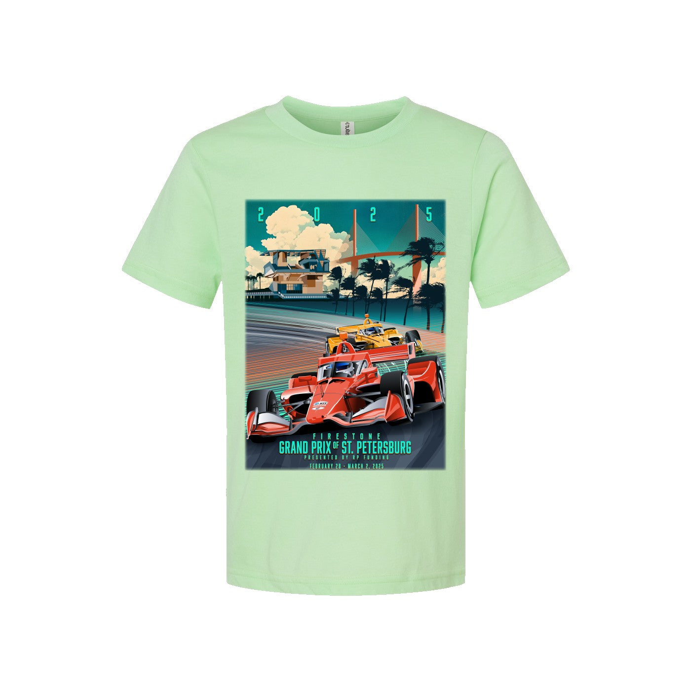 This 2025 Firestone Grand Prix Youth Tee in mint is perfect for young racing fans! Made from a soft blend of ring spun cotton and polyester, this tee showcases the INDYCAR event for the St Petersburg race. Support your favorite drivers in style and comfort with this event tee.