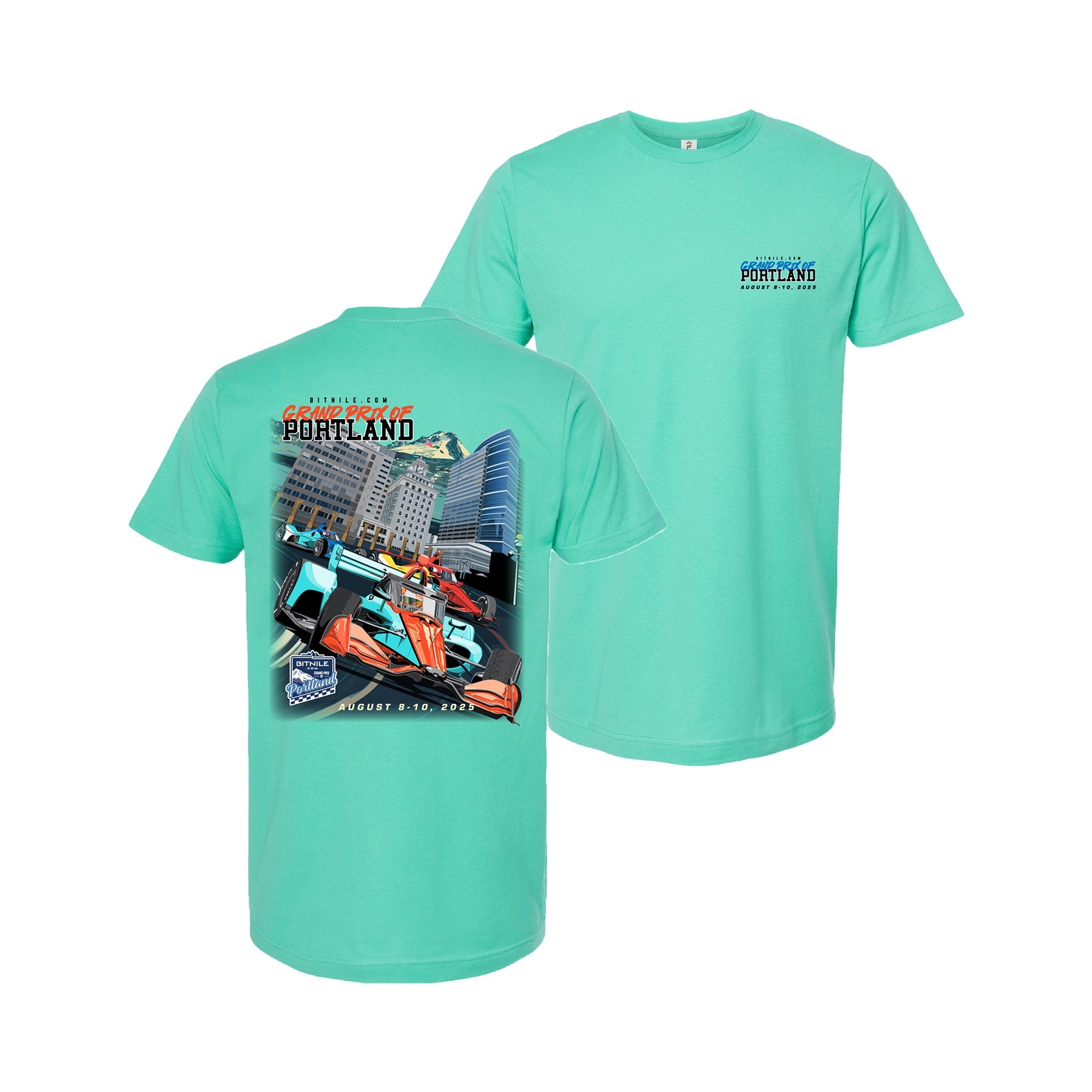 Celebrate the thrill of the 2025 Grand Prix of Portland with this official INDYCAR event tee. Crafted from 100% soft cotton, it offers all-day comfort whether you're trackside or showing your passion elsewhere. Featuring a bright mint design, this shirt is a must-have for fans wanting to capture the excitement of Portland International Raceway in style.